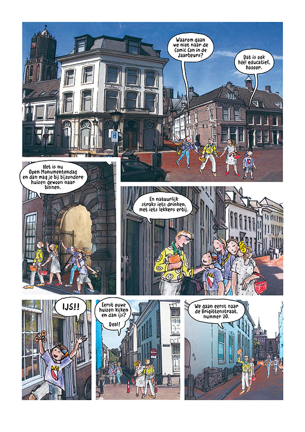 De strip geeft een inkijk in de geschiedenis die verborgen ligt achter ‘gewone’ historische gevels. Niet de bekende monumenten, maar minder opvallende woonhuizen en winkels