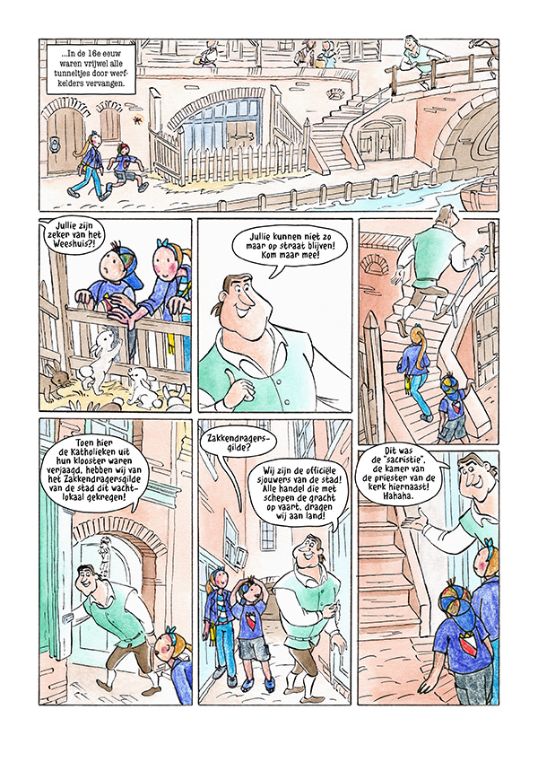 – panden met een lange historie als timmerwerkplaats, apotheek, schuilkerk, armenhuis, drukkerij. De strip toont elementen uit de geschiedenis van de afzonderlijke huizen, tussen 1550 en 1950,